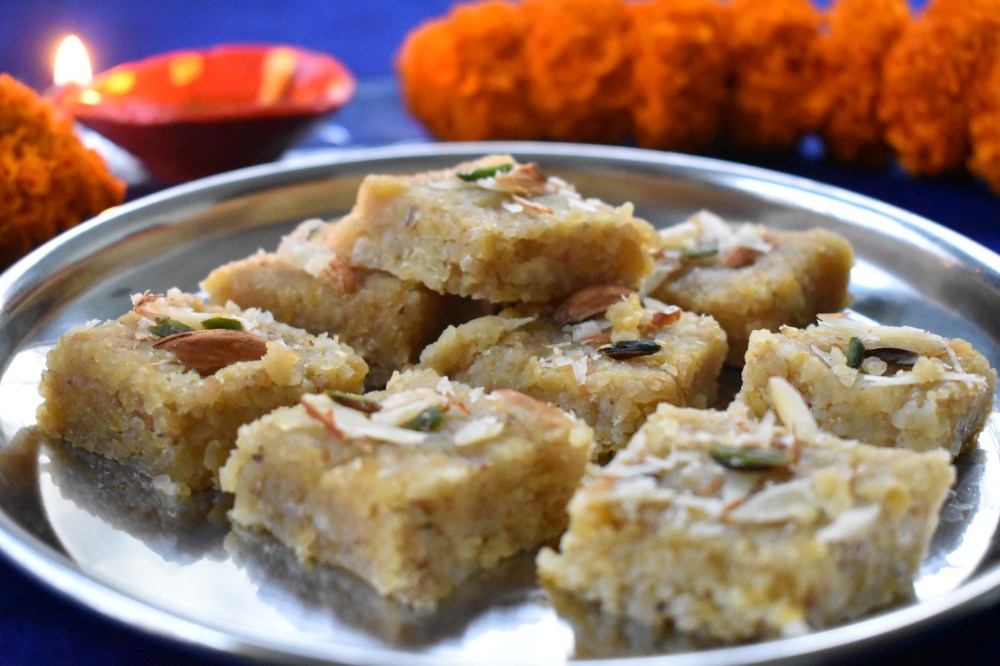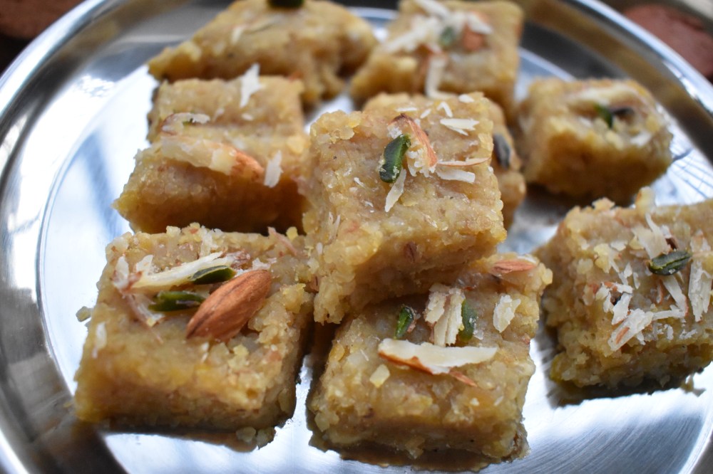 On the occasion of these auspicious five days of Deepawali festivities beginning with Dhanteras and culminating with Bhai Dooj , I am sharing this recipe of Dalia lentil barfi with you all , which you may try for your sweet celebrations. Hope you are really going to like it. This recipe is actually a result of an attempt for trying something that can compensate for the craving of the usual khoya or chhena in sweets which are a must have during any kind of celebrations in our home especially for the forthcoming Bhai Dooj, as my brother is really fond of khoya & milk sweets. However he is now on a no dairy diet, so satisfying his craving for sweets becomes a real challenge. But my aunt’s recipe for this Dalia-lentil barfi has all the components that can please him and I am sure he will just keep gorging on them….ππ
