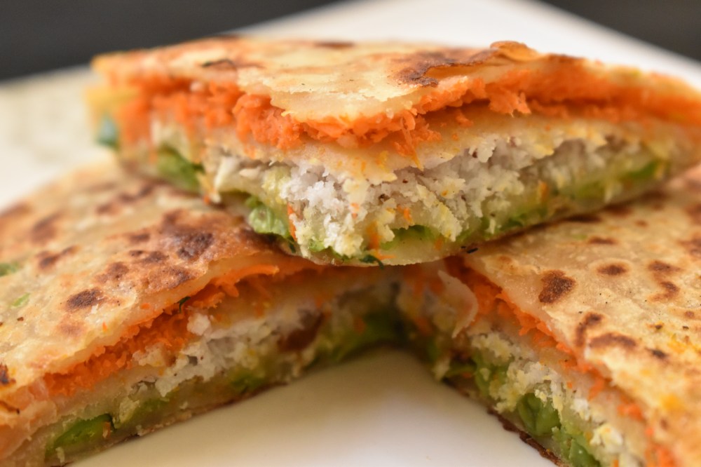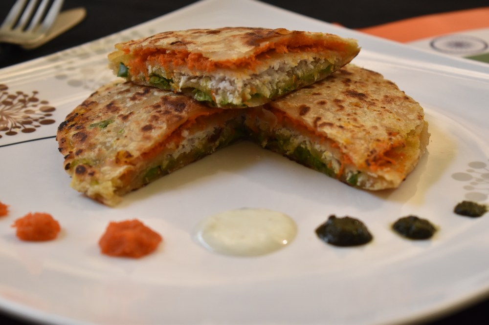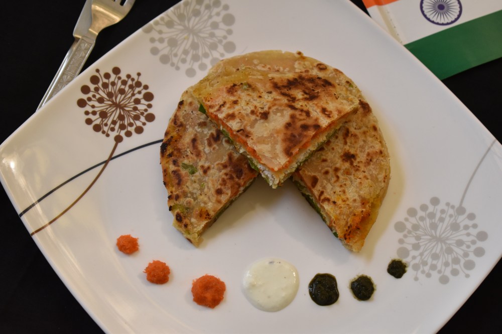 This time celebrating the spirit of our 72nd Republic day with this tricolour stuffed parantha (Indian pan-fried stuffed flatbreads) served with chutneys(dips) of three colours in the breakfast & feeling patriotic. The stuffed parantha had three layers of stuffings.👇 Kesari (deep saffron) layer comprising of grated carrots sauteed with spices and salt. White layer consisting of sauteed coconut crumbs and flax seeds with spices and salt.