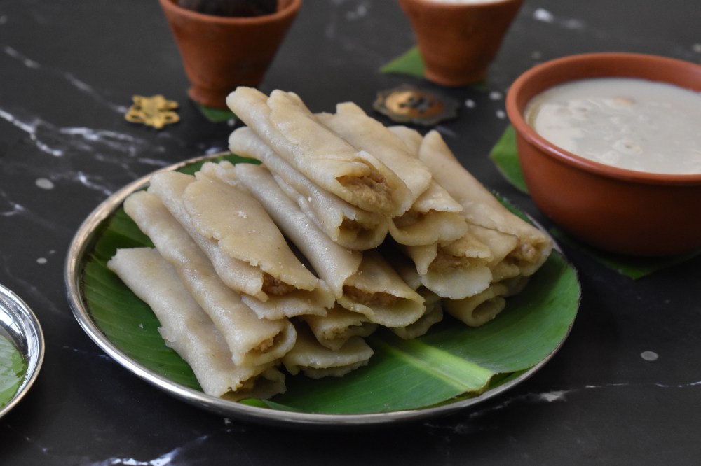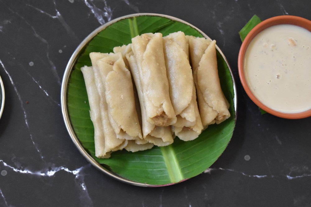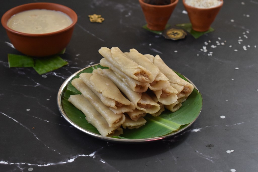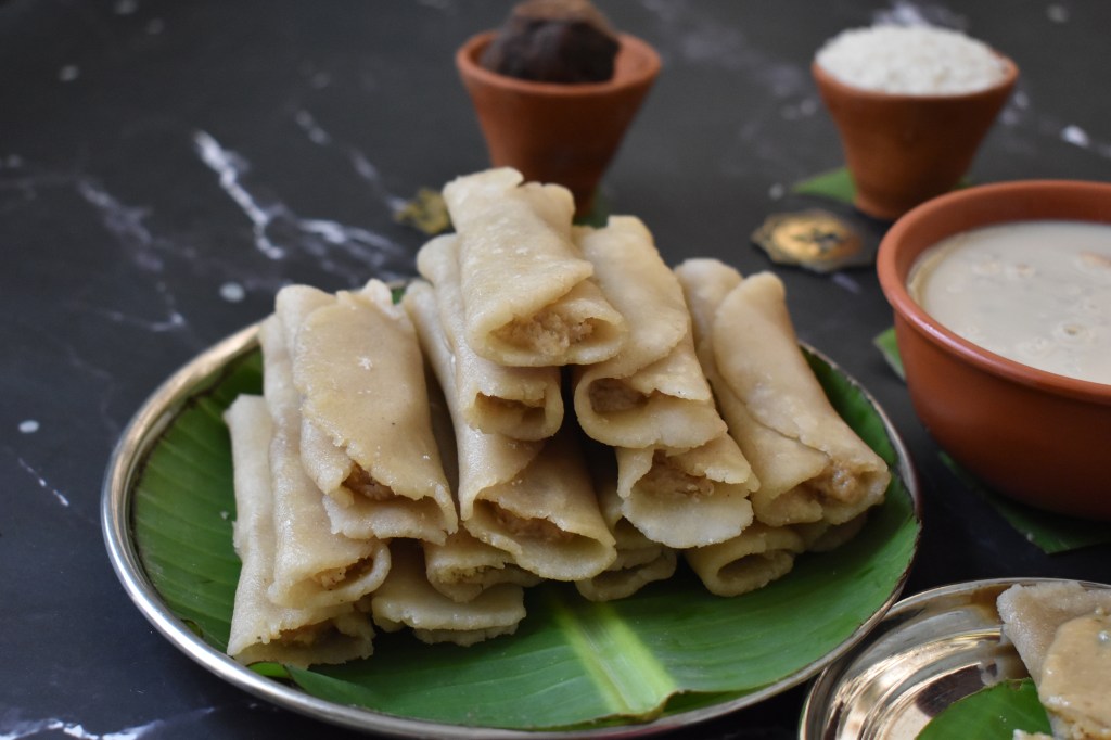 Patishapta, as many of you must be knowing are nothing but pancake rolls mostly made of rice flour stuffed with sweetened coconut or mawa/khoya or just any filling of choice. However, this time I haven’t played with the component of the wrap or pancake or the filling. Rather for a change, I changed the way the wrap is prepared by giving it a healthy twist where the rice flour is rolled into patishapta(s) with stuffing inside and then steamed instead of frying. The traditional version of patishapta is prepared from a batter of a mix of rice flour & semolina which is then used for preparing the pancake wrapping around the filling. It requires heavy use of oil as the pancakes are fried. But this version of the dish is healthier than the pancake version as it requires minimal use of oil and the pithas are steamed instead of fried. Not only healthy, I feel this version of the dish is far more easier and less time consuming as making perfect patishapta(s) at one go needs lots of practice & skill and surely counts on your patience. These steamed patishapta(s) can be easily made even by the beginners without any expertise. Also I found its taste quite similar to the usual version or may be even better as the rolled cake cooks uniformly with this method. Since this is not fried and has very less oil in it, it is also much lighter on your stomach. Although the traditional varieties are always unbeatable but the quest for something different and convenient will surely not going to disappoint you in the end. Now, without elaborating more on it, let us now move to the recipe straightaway & start making your perfect patishapta(s) with minimal effort :