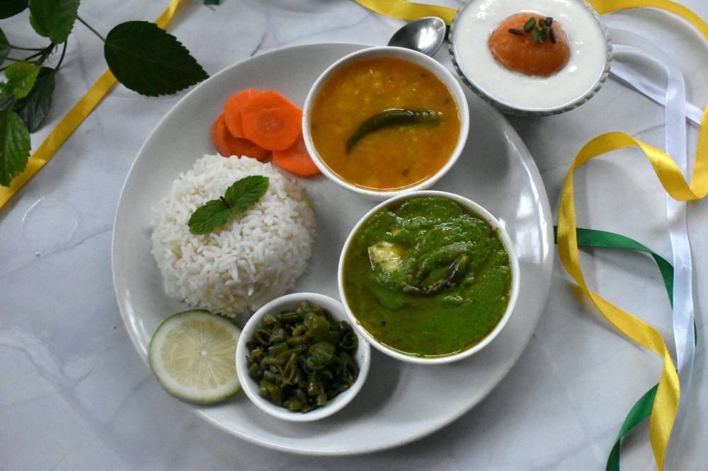This time, I thought of preparing a simple tricoloured meal platter for lunch. The three colours of tiranga are distinctively visible in the items in this meal platter e.g., the daal in the platter displays the saffron colour , the rice which is the staple in the plate displays the white colour and the green colour is displayed with the Steamed paneer in green gravy and in the sauteed beans & capsicum. The meal concluding bowl of doi mishti representing the dessert also incorporates the three colours in it, like the saffron coloured bengali sweet komla bhog topped with some chopped green pistachio & paired with the plain curd or doi which represents white colour, slightly elevating the common and usual bengali dessert dish of doi roshogolla or doi mishti, that too in a patriotic way. So, there is a mishmash of the three colours of indian flag everywhere in this platter creating a feel of complete patriotism in a foody way…😀😀