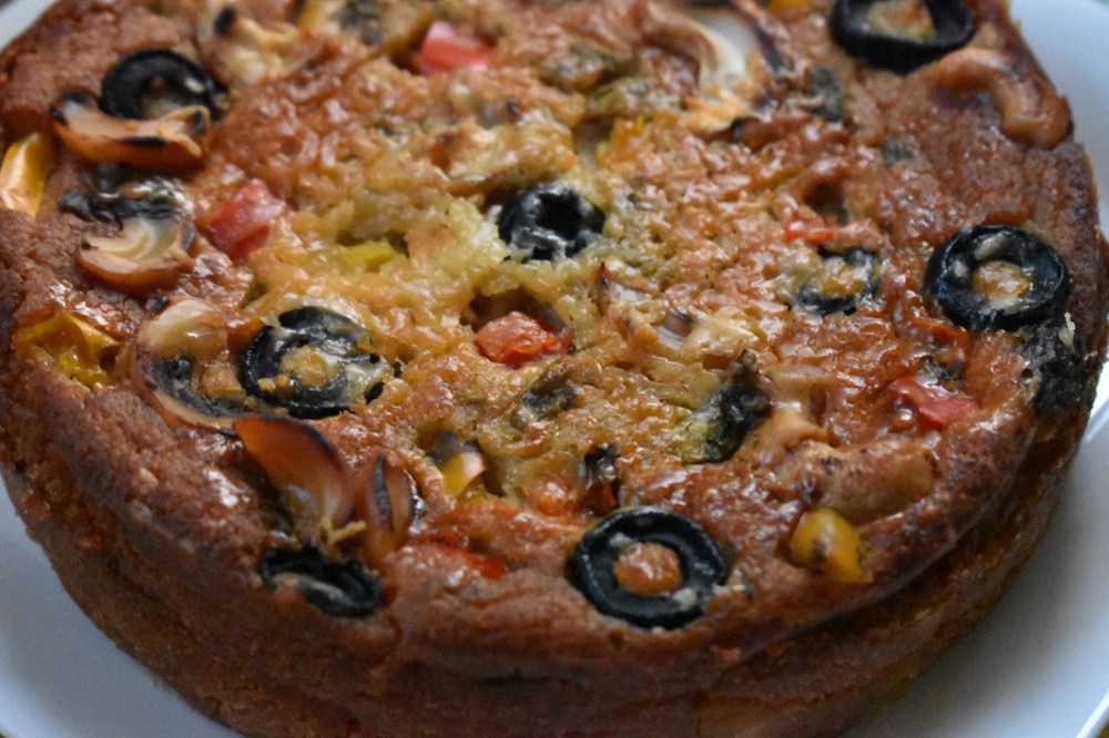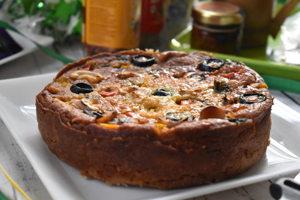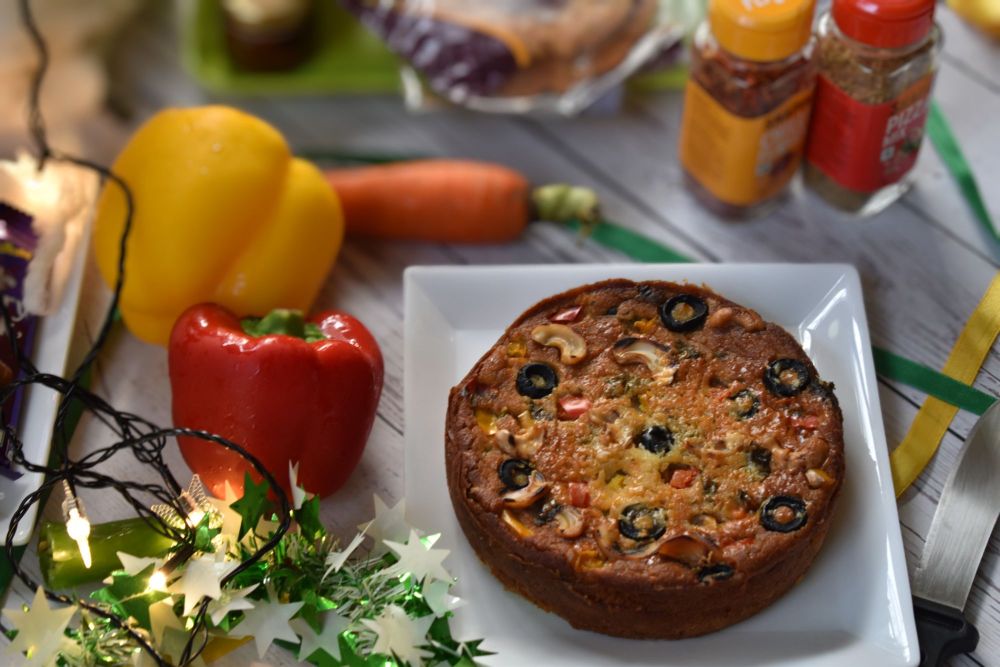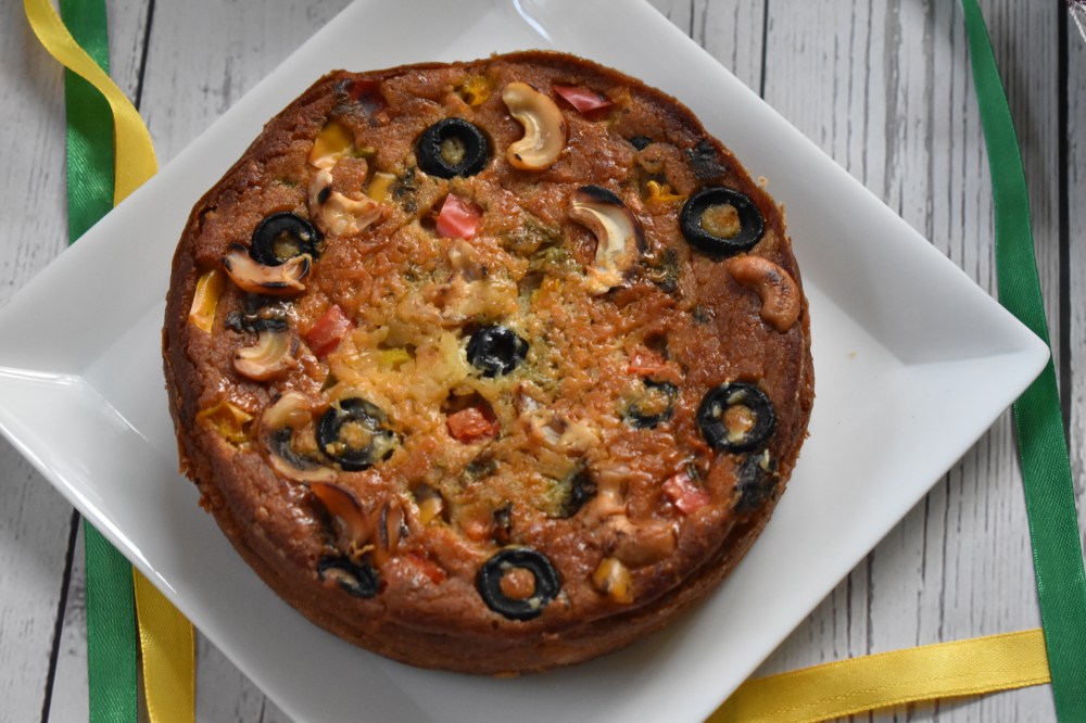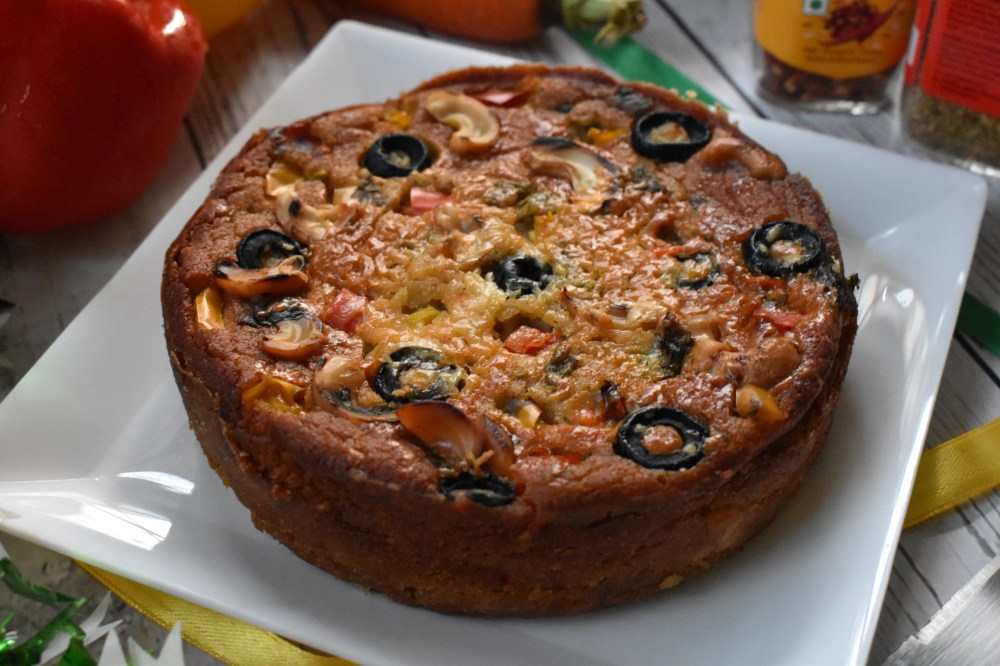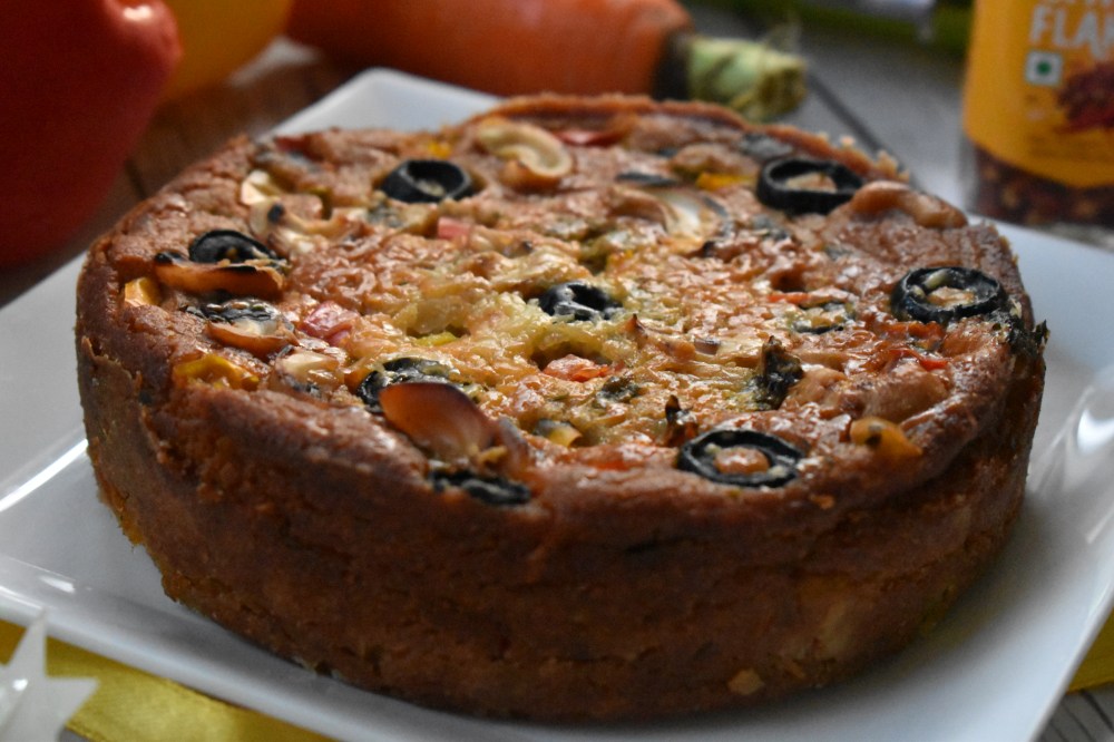 - Your delicious savoury cake is ready to be gorged on, grate some more cheese & sprinkle some chilli flakes, I bet you will forget your favourite pizza. Enjoy it hot with a bowl of warm soup or hot cuppa.
