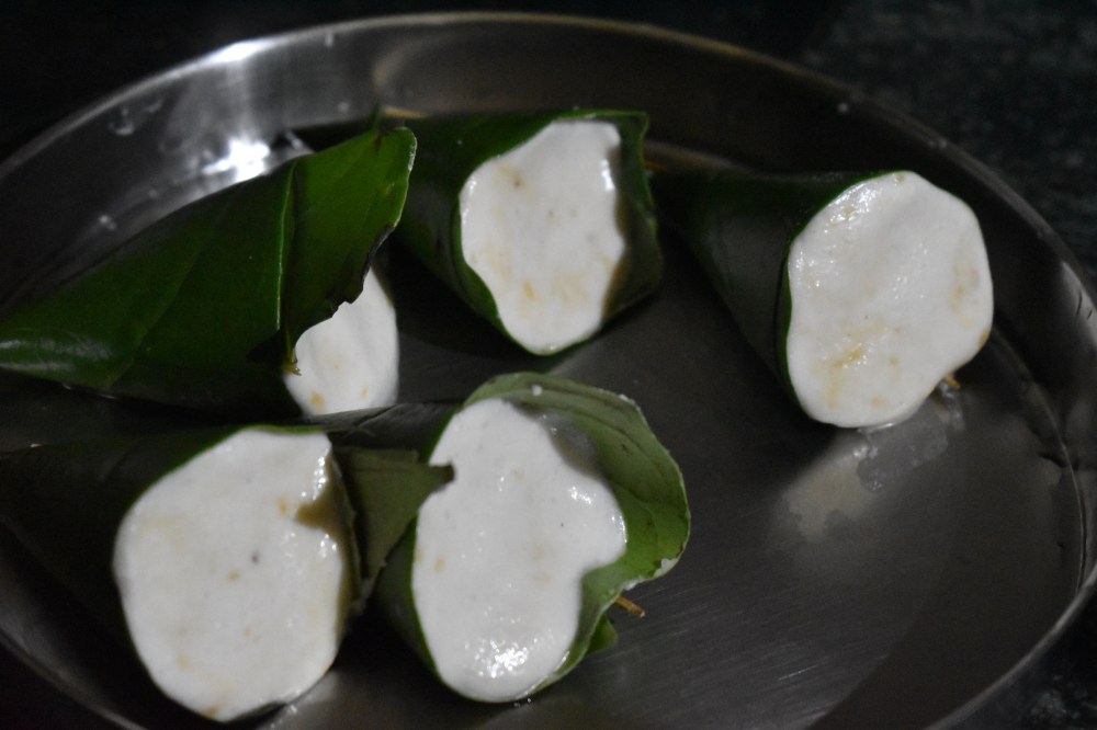 - Now for preparing the cones, take a pinch of the batter and put it in the extreme pointed end of the leaf cone. Take little more of the batter and spread it uniformly along the sides to cover it entirely, so that no gaps remain. The batter should uniformly spread over the walls of the cone ( Note: The coat should not be too thick, as it may affect the taste or it should not be too thin, otherwise it may get cracked after steaming).