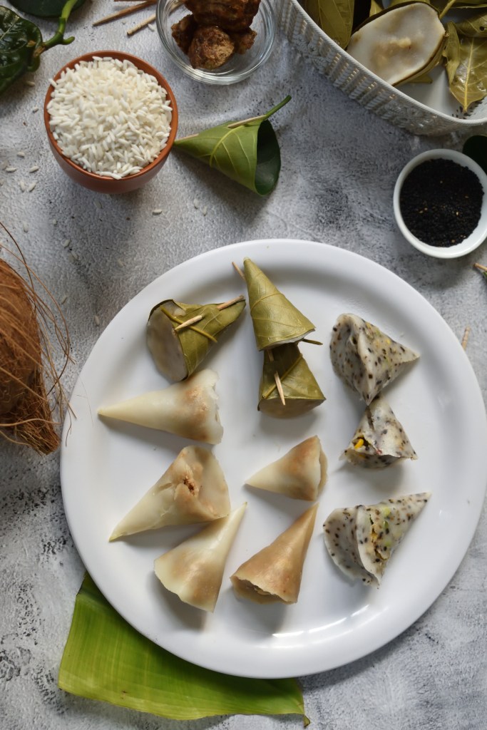 As you know now, most of the pithas have rice in it, we are baffled to see that in how many ways the rice could be prepared. Rice batter or rice powder is given so many forms like in dumplings, pancakes, steamed or fried either as sweets or as savouries which are usually not so common during other times of the season. India is a huge country with so many states that have rice as their staple and most of them celebrate their harvest since ancient times with a variety of rice based dishes. Every rice eating state in India have their own riced based dishes and many dishes have stark similarity as if all have originated from the same roots. As for example, the kozhukatai of tamilnadu, modak of maharashtra, sheddho pitha of bengal, mohura pitha of assam, patoli of odisha, Holle of goan or many such steamed rice cakes of eastern and northeastern india are quite similar in their preparation or techniques. On seeing these dishes you feel that a similar technique has been followed and changes were made in due course based on the ingredients, equipments or resources available to them.