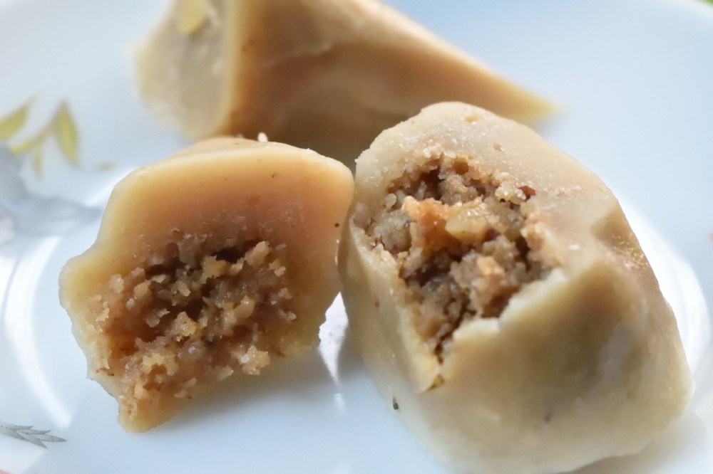 This is Poush Parbon or Bhogali Bihu once again and the best way to celebrate the festival is to indulge yourself in the enjoyment of making and savouring delicious Pitha(s), the traditional sweetmeats or savouries with rice as an important ingredient along with other additives like jaggery, sesame seeds, coconut, lentils, sugar, cream, milk etc. which are made throughout the east and northeast of India in a number of varieties. Pitha making had been a practice which i had experienced since my childhood on the occasion of makar sankranti which is known as magh bihu or bhogali bihu in Assam. I grew up seeing my grandmoms, both paternal and maternal too much preoccupied with making pithas during this occassion by staying awake late in the midnight & rustling up a full platter of pithas both sweet and savouries for the special breakfast in the morning of Makar Sankranti as well as for day long snacking for entertainment of the family members & guests. While they used to make piping hot pithas, they would allow us especially their beloved grandchildren to take a bite or two and tell them the taste. Now and then they would offer some samples to taste to the family members to tell them if any improvisation was required. After them, I have also seen my mum and aunt to do the same and I guess it is indeed similar in almost every household here. These freshly made piping hot pithas are really divinely delicious. Although the taste is no less the next day but the pithas straight from the flame are just incredibly delicious.