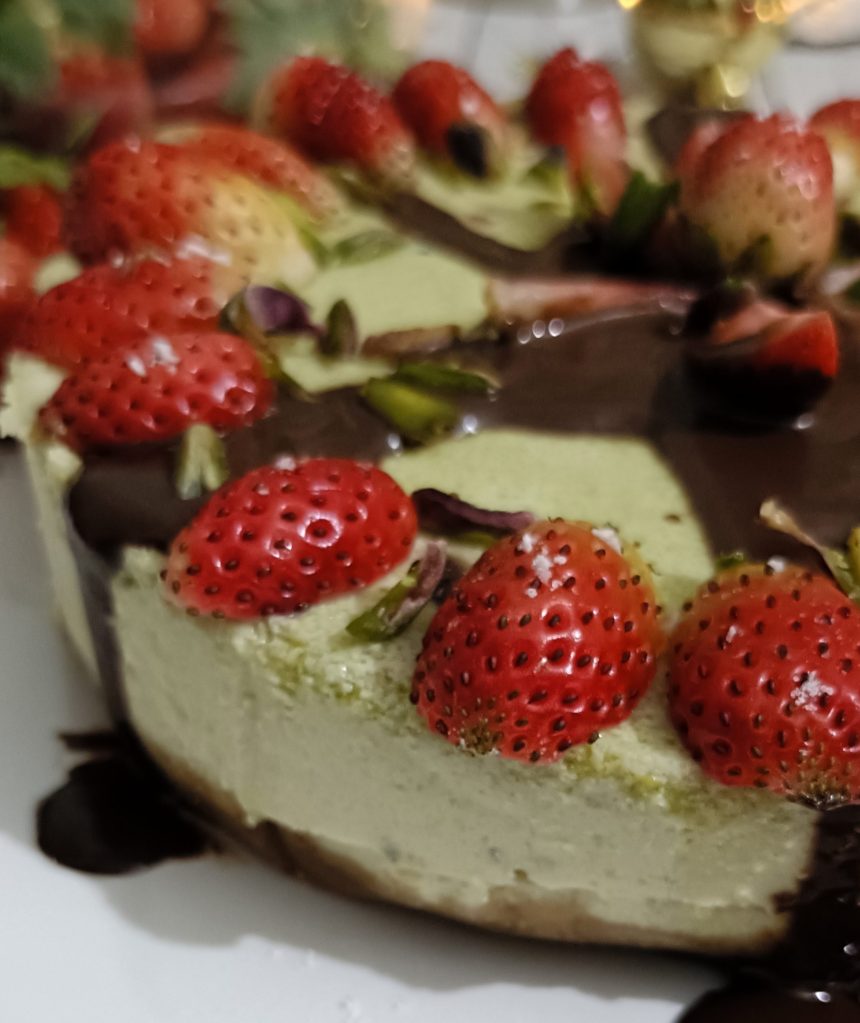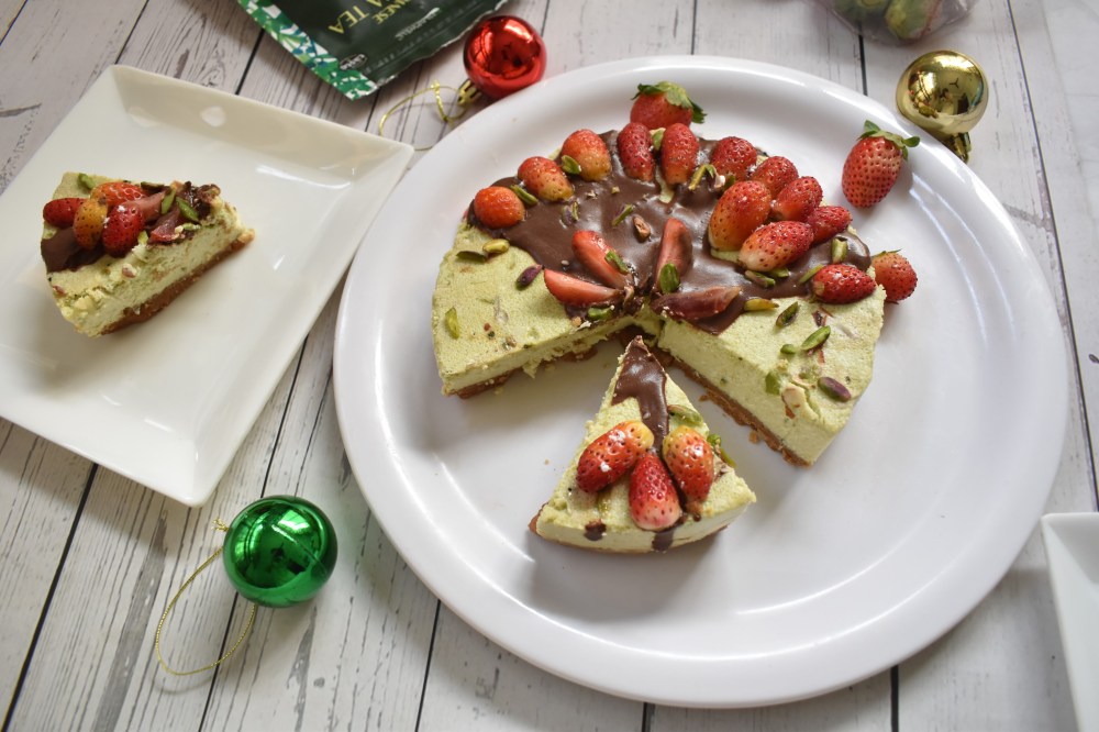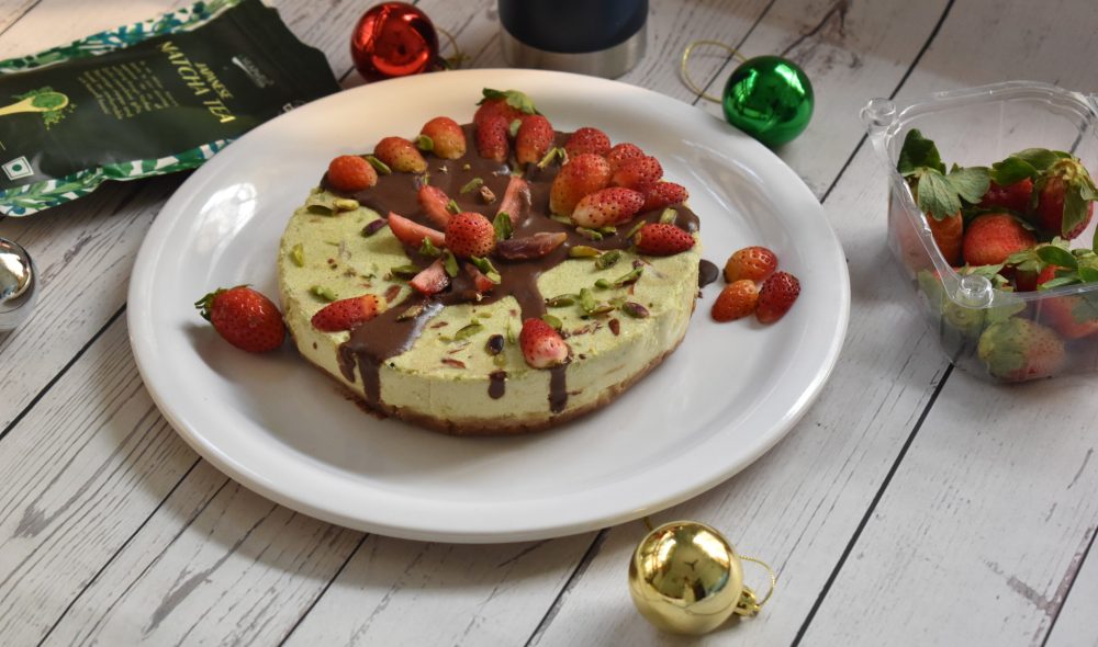 - Garnish your Matcha cheesecake with any toppings of your choice. I have poured some molten chocolate and topped with fresh strawberries and chopped pistachios to relish y soft, velvety Matcha cheesecake.
